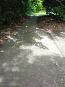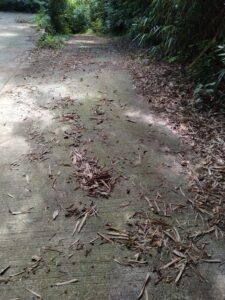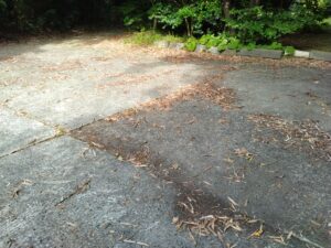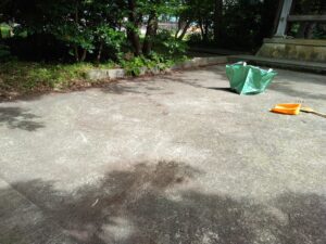 落ち葉や木の実などが落ちていて、コケなども生えている状態。しっかりと掃き掃除を行い、コンクリート面が綺麗に顔を出してきました(^o^)