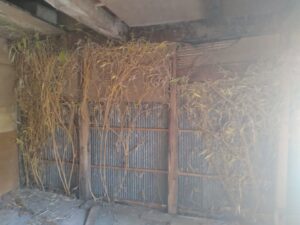 現場を見て驚愕(;´Д`)!!車庫の壁とベニヤ板の間から「竹(篠竹)」が生えていました。